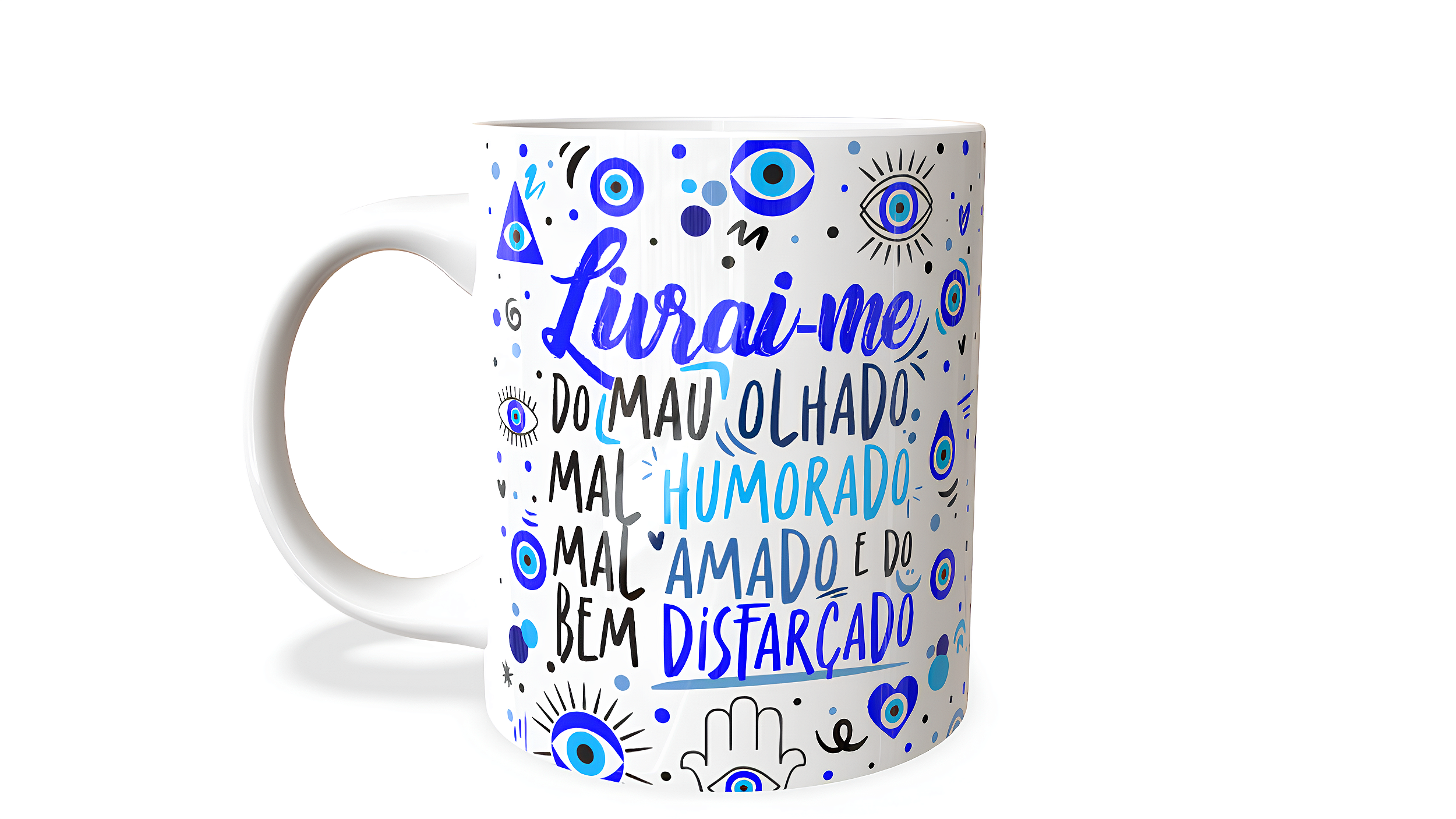 Traga leveza e proteção para o seu dia com a Caneca "Livrai-me". Com design moderno repleto de olhos gregos e símbolos de energia positiva, a peça destaca a frase: "Livrai-me do mau-olhado, mal-humorado, mal-amado e do bem disfarçado". Perfeita para começar a manhã com bom humor e aquela dose extra de boas vibrações. Ideal para presentear ou para deixar sua rotina mais divertida e protegida.