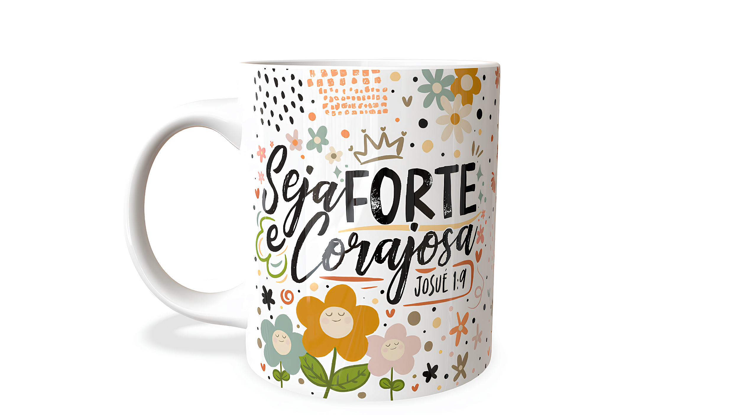Traga mais beleza, fé, motivação e inspiração para sua rotina. A caneca "Seja Forte e Corajosa" possui design delicado, alegre, cheio de charme e personalidade, trazendo flores sorridentes, elementos coloridos e um toque artístico com lettering moderno, criando uma peça perfeita para acompanhar seus momentos favoritos como aquele café quentinho de manhã, o chá relaxante da tarde ou até mesmo podendo ser utilizada como decoração especial no seu cantinho, transmitindo leveza, coragem e boas energias em cada detalhe.
